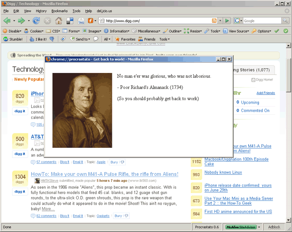 I have a Firefox extension called Procrastato. It reminds you to get back to work when you’re mindlessly surfing the web. Procrastato is a very simple add-on but I’ve found that getting started in developing Firefox add-ons isn’t so simple.